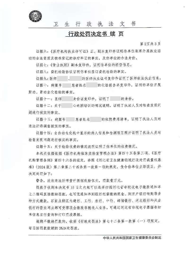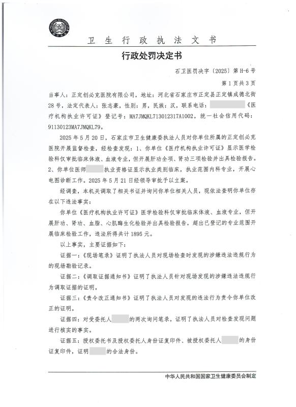 正定创必克医院有限公司超出已登记的专业范围开展临床检验工作案