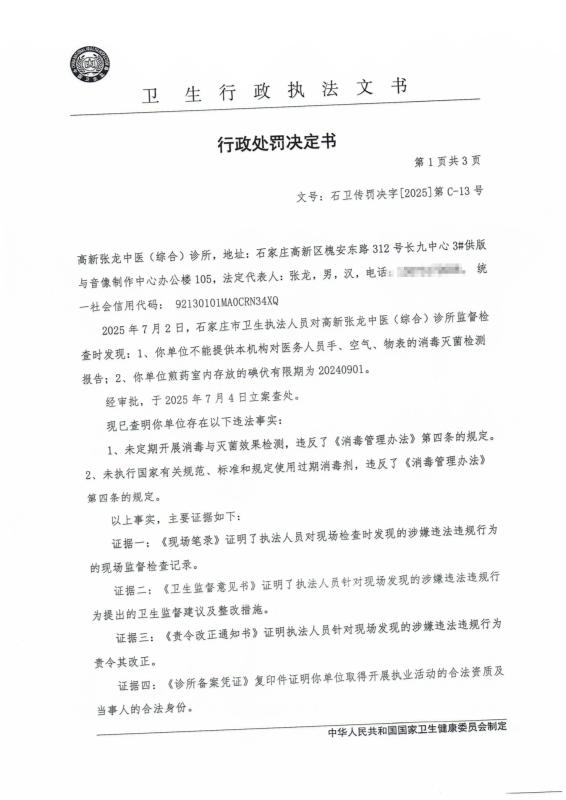 高新张龙中医(综合)诊所未定期开展消毒与灭菌效果检测案